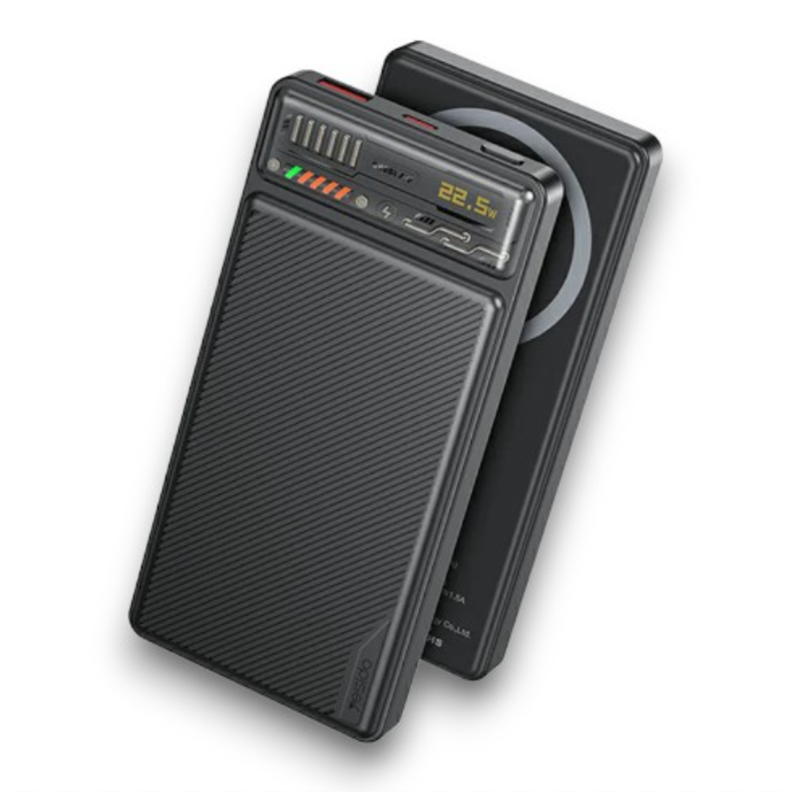 YESIDO YP57 is a 10,000 mAh power bank with 15W magnetic wireless charging and fast wired output up to 22.5W. It features a transparent LED display, supports 3-device charging, and has a sleek, durable design—perfect for daily and travel use.